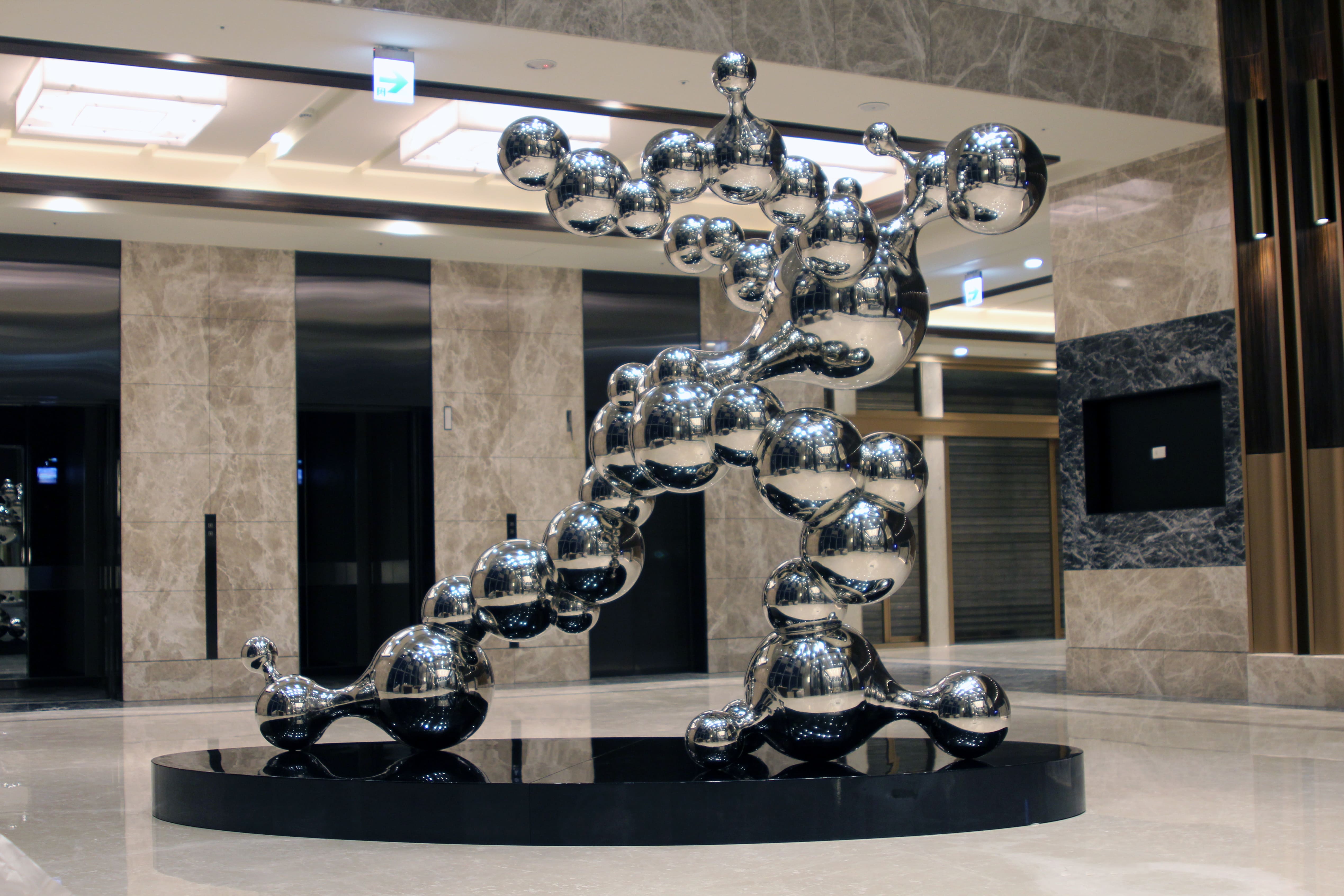 介紹:藝術家吳東勳無意間看到孩子們在遊戲場吹肥皂泡泡,這些泡泡在空中相互串聯,逐漸形成越來越大的泡泡,最後又逐漸分散與消逝,每一次的形狀都不一樣,激發出 Bubble Man 的創作靈感,也成為他的長久以來的創作主題。吳東勳從肥皂泡泡激發出靈感,結合了文藝復興時期對人體之美的描繪,以 3D 程式精算讓每個不銹鋼泡泡都能完美結合,不但為古典美學找尋出新的詮釋方式,也構築出Bubble Man跨越時空的永恆之美。