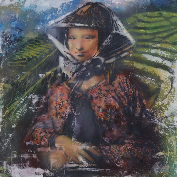 《蒙娜麗莎》這幅堪稱世界最知名的畫作實則有著一抹最為神秘的微笑。在Colasa靈動的畫筆下,這位女士也成了頭戴斗笠、包巾,身著鋪棉小碎花衣裳的採茶姑娘,恰如其分地,融入了台灣優質茶文化的情境之中。