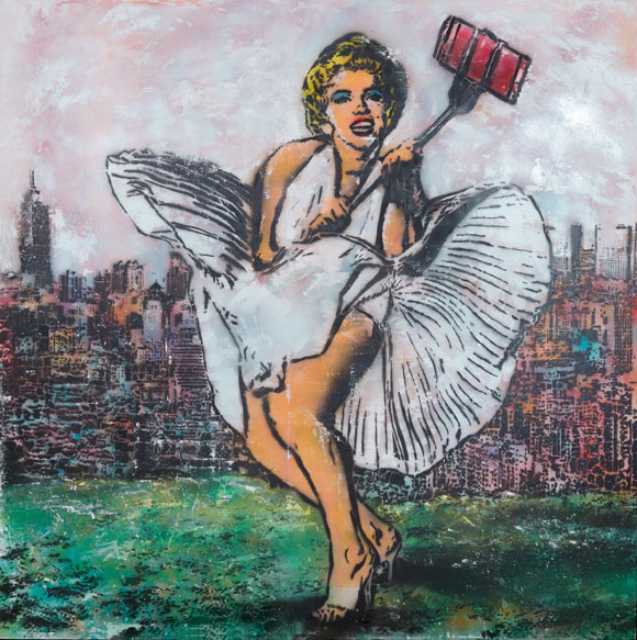 這張裙擺飛揚的照片,是美國20世紀最性感女演員—瑪麗蓮夢露最為膾炙人口的圖像,當她不再壓著裙擺,而是手握時下最流行的自拍棒,與台北獨特天際線留下完美的自拍照時,女神充滿自信的體態之美,仍是那麼樣的引人遐想。