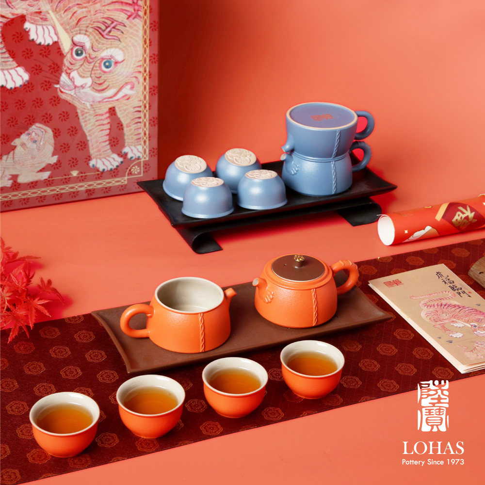虎尾刻壺把、虎爪飾壺嘴、壺鈕綴手工描金旋型虎紋。 杯底精雕虎頭門環,精雕版畫圖樣的茶托有著皮革般的質感。 將趨吉避凶的「虎」意象融於整套茶禮,招祥致瑞,虎至福至。