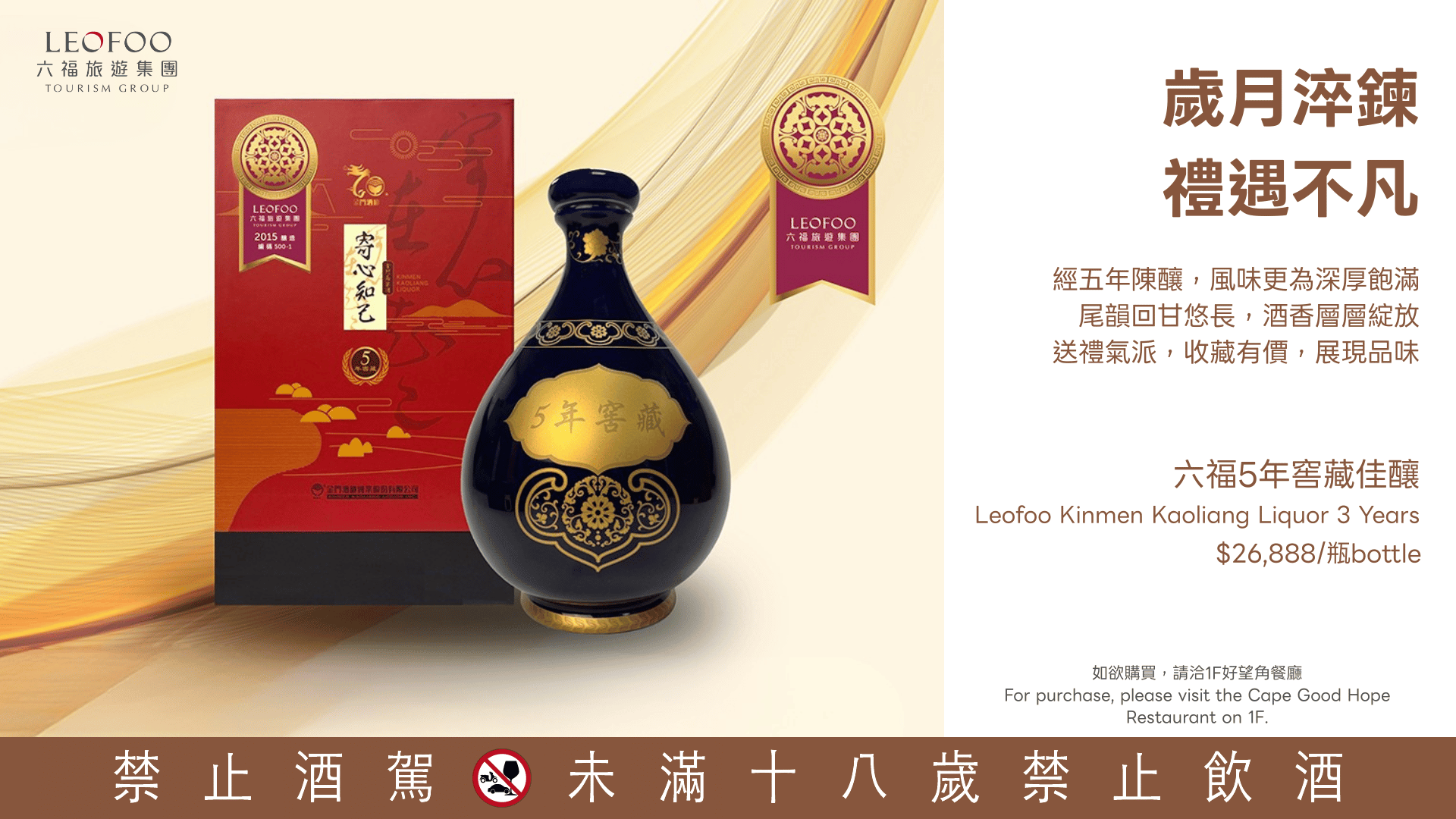 「六福窖藏佳釀」由金門酒廠首席品酒師精選陳年高粱,以100%糯性紅高粱冬釀而成,歷經上千個日子熟成,滴滴皆為時間的積澱,每瓶皆有限量編號及典藏證書,瓶身採用藍彩瓷瓶與金飾細節呈現典藏氣度,展現獨一無二的尊榮。