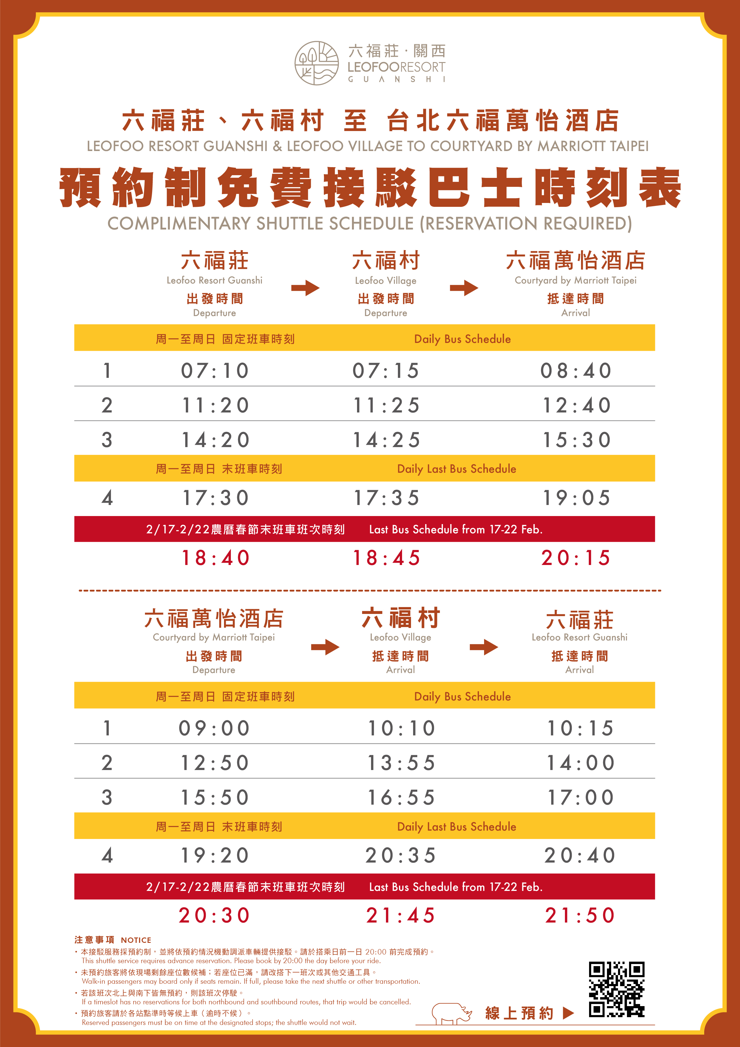 ● 本接駁服務採預約制,並將依預約情況機動調派車輛提供接駁。請於搭乘日前一日 20:00 前完成預約。