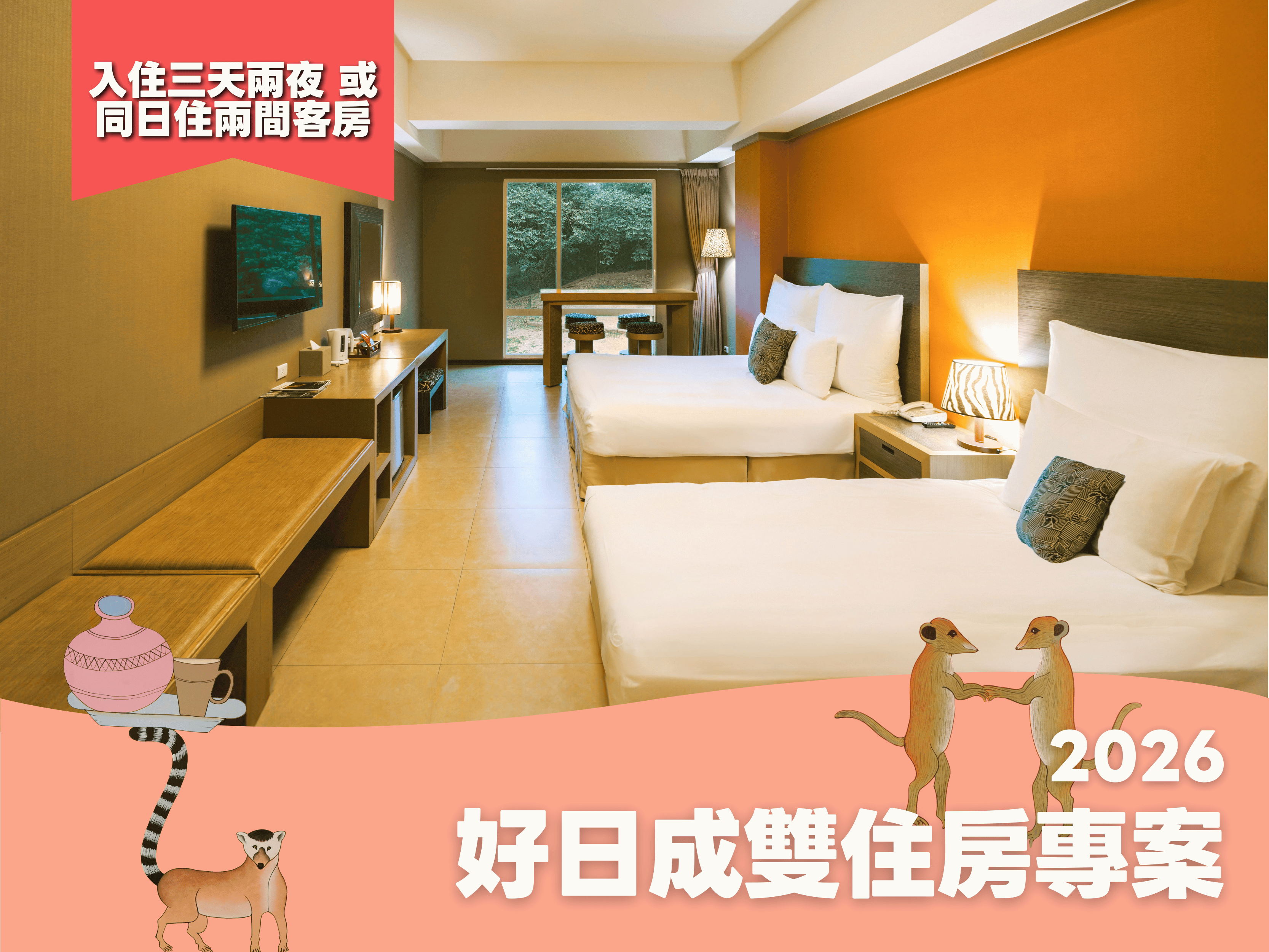 1. 加人加價:0-2歲可免費同住;【住一晚送一晚】3歲以上每位加價$2,500+10%(含早餐2客、六福村入園手環1條);【住一間送一間】3歲以上每位加價$1,600+10%(含早餐1客 或 六福村入園手環1條),專案依房型入住上限人數為準,剛果客房至多四人,肯亞客房至多六人。