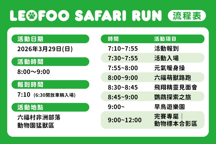 •動物園內部分路段高低起伏較大且路面不平整,隨身手拉車、行李箱等隨身行李於路跑期間恕不開放入場,請先放置於自駕車內,待路跑結束後再行取用,現場不提供寄放服務。